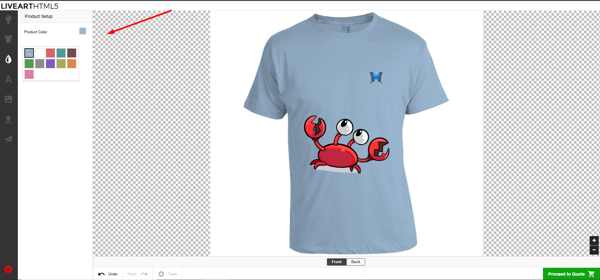 LiveArt simplifies product setup by allowing a single product listing to include multiple color options within the designer.